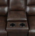 A brown motion sectional will make watching movies your new favorite past time. Upholstered in performance grade leatherette, this buttery soft fabric makes the ideal seating experience. This reclining sectional offers coil pocket cushioning and vertical tufting. Built in cup holders keep drinks on hand while lift top storage keeps remotes concealed. Use this transitional power reclining sectional for many different types of bedroom styles.